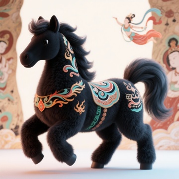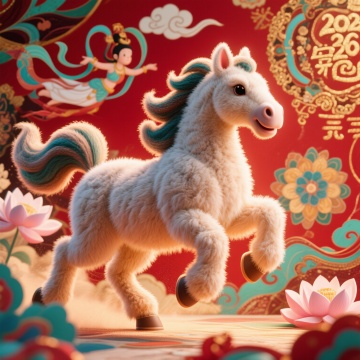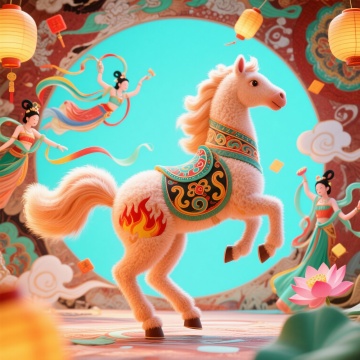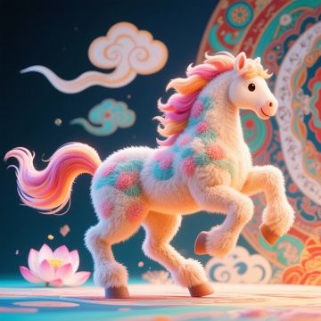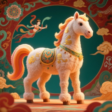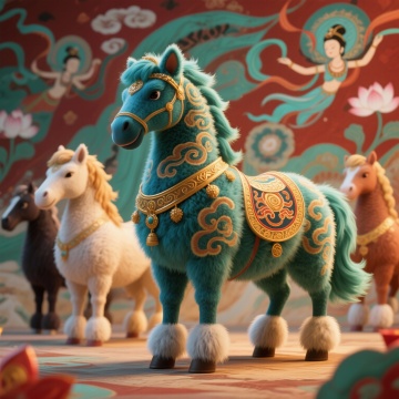 2026马年元旦主题,敦煌壁画风格,毛绒质感的插画,画面中融合敦煌传统飞天元素与可爱的毛绒马形象,背景有祥云和莲花纹样,整体色调采用敦煌壁画的赭红、石绿、金黄等传统色彩,呈现出温暖喜庆的节日氛围