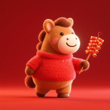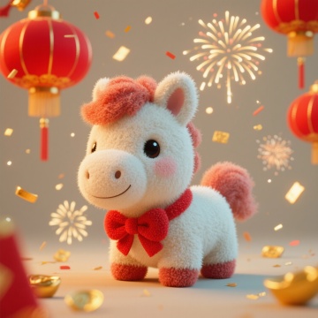 软3D毛绒风格,卡通童趣女孩骑红马,喜庆春节元素环绕,粘土质感与毛发生长细节融合,营造温暖可爱的节日氛围。