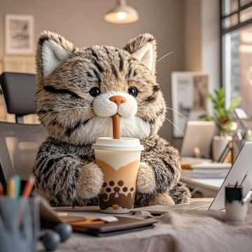 拟人风3D角色,猫咪身着商务西装,手握咖啡杯,办公桌前专注工作,展现职场幽默感。