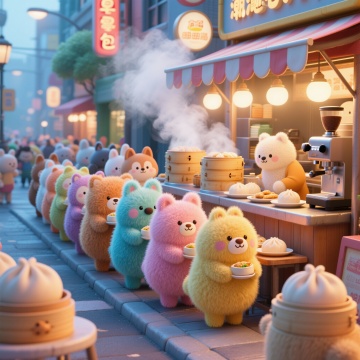 梦幻夜景中的毛绒小动物在软3D风格的童话乐园中欢快奔跑,融合粘土质感与卡通元素,营造出温馨可爱的节日氛围。