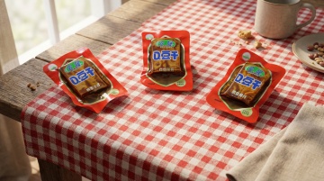 把图片产品做成充满创意和梦幻色彩的绘本风格的巨型毛毡艺术卡通风格雕塑放置在画面中心(产品的包装保持不变),人物站在一旁欣赏(与巨型产品形成比例反差),围栏隔离展示,背景是“好味屋”零食店门口