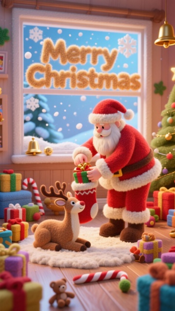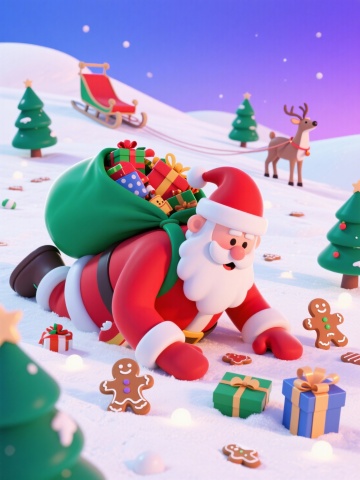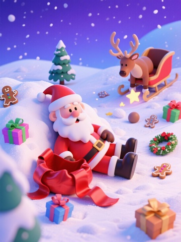 软3D粘土风圣诞场景,萌趣圣诞老人与驯鹿雪橇,搭配梦幻月夜与温馨小屋,营造可爱、喜庆、梦幻的节日氛围。