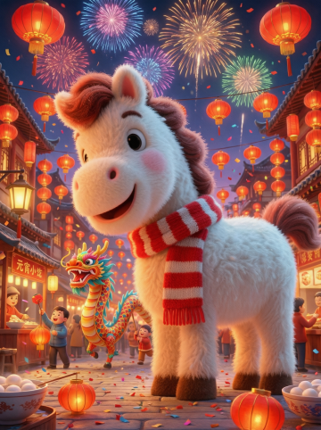3D立体渲染可爱角色IP形象,一只浅灰色毛绒质感的马玩偶,正面视角,睁一只眼闭一只眼,面带微笑,手持红色灯笼,灯笼上有金色“福”字,肚子大大圆圆的,嘴巴大大圆圆的,头部有一点点侧倾斜,灯笼风格为C4D
