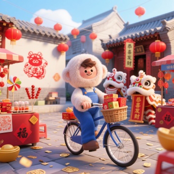 3D立体渲染可爱角色IP形象,一只浅灰色毛绒质感的羊玩偶,正面视角,睁一只眼闭一只眼,面带微笑,手持红色灯笼,灯笼上有金色“福”字,肚子大大圆圆的,嘴巴大大圆圆的,头部有一点点侧倾斜,灯笼风格为C4D风格、blender、OC渲染器,颜色温柔极简,背景为纯红色,整体构图简洁,红色主调营造浓厚节日氛围,寓意吉祥如意