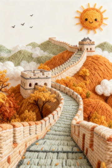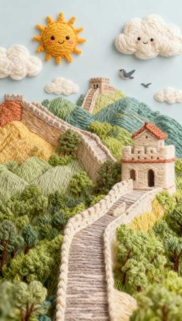 刺绣风微缩艺术,拟人化太阳云朵,中式长城蜿蜒于绿意山峦,可爱卡通感与梦幻清新交织,温馨趣味尽显。