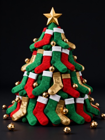 3D风格圣诞树由红绿金三色袜子堆叠而成,融合重拟物与面料质感,点缀金属铃铛与金色星星,营造浓厚喜庆氛围。