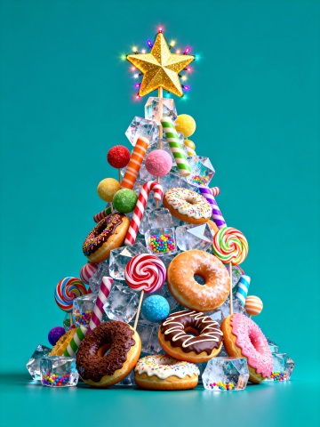 3D重拟物风糖果圣诞树,融合波普艺术色彩与光泽质感,满载甜蜜与趣味,闪耀喜庆梦幻氛围。