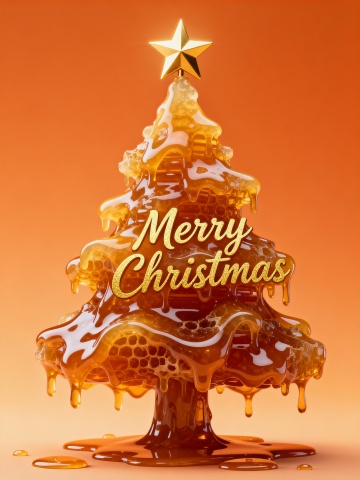 液态蜂蜜流淌的3D圣诞树,鎏金星顶与闪亮字迹交织,重拟物风呈现甜蜜梦幻的节日温馨感。