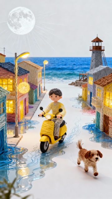 密集的楼房巷子中,一个人骑着黄色电瓶车行驶在积水的街道上,行一道月光照在行人上。街道旁装饰着亮灯的路灯,建筑灯火璀璨,还有远处的大海,和一个瞭望塔,后面有只小狗在追