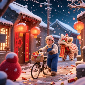 软3D国潮风,卡通人物骑车穿行雪夜街巷,红灯笼与舞狮烘托喜庆氛围,毛发生长质感增添温馨梦幻感。