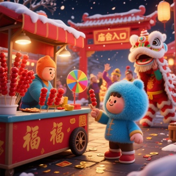 软3D国潮风,毛发生长质感卡通人物,雪夜庙会喜庆场景,糖葫芦摊与舞狮互动,温馨趣味十足,春节氛围浓郁。