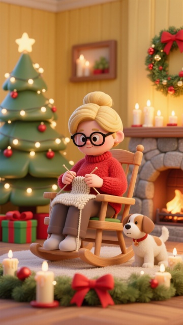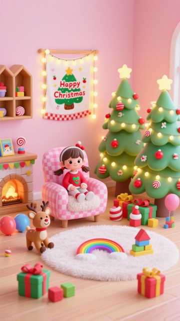 毛绒质感的圣诞树搭配3D微缩艺术风格,卡通化圣诞老人与驯鹿穿梭其间,彩球、礼物堆叠如毛线球,营造出温暖喜庆、趣味十足的节日氛围。