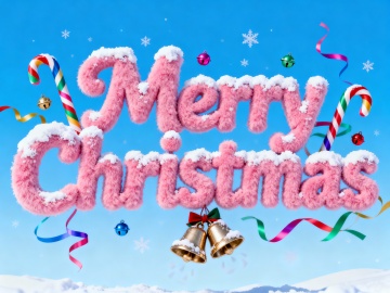 粉绒毛3D字体搭配雪景与糖果手杖,软萌卡通风营造喜庆甜蜜的圣诞氛围。