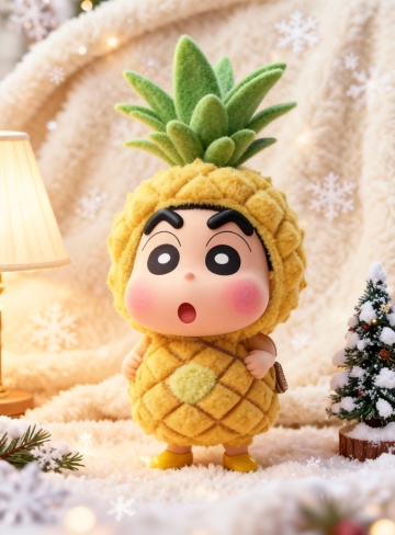 软3D风拟人菠萝娃娃,毛发生长质感面料包裹,萌趣表情充满可爱与温馨,圣诞雪景烘托梦幻节日氛围。