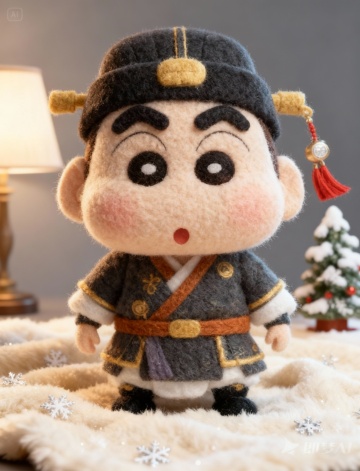 软3D毛绒质感卡通形象,融合传统服饰与圣诞元素,萌趣可爱,温馨节日氛围浓厚。