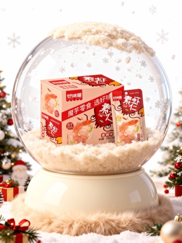 将商品放置于巨大的水晶球中置于中央,突出产品主体,球内有米白色绒毛雪飘落,底部积绒毛,底座为奶白色半球形,前面放置圣诞装饰,背景为暖白色圣诞风。