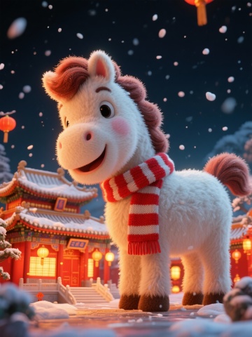 软3D风格的拟人小马,毛发生长细腻,戴红白条纹围巾,置身雪夜国潮庙宇前,喜庆温馨,梦幻可爱。