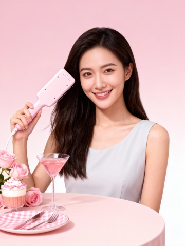 温柔甜系少女风调性,配色以淡粉、奶白为主,色调柔和温馨;一共有两个平行的粉色台面;采用平视视角,主体立在视觉中心粉色台上,占约 30% 视觉空间;周围点缀粉色漂浮花瓣,主体边上放一朵粉色小花,背景:竖纹玻璃后面有粉色台,台上有几朵粉色白色花艺,主体与全粉场景色调呼应;暖米色墙面,用柔光渲染强化温馨感,浅景深处理,主体清晰锐利,背景元素柔和虚化提升氛围。