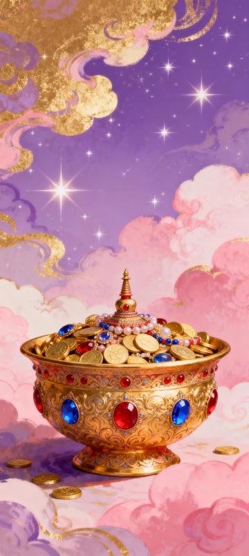 梦幻水彩风插画,中式古典葫芦瓶以玻璃质感呈现,镶嵌宝石与金纹,云雾缭绕,倒影水中,超现实意境,紫气东来发财壁纸