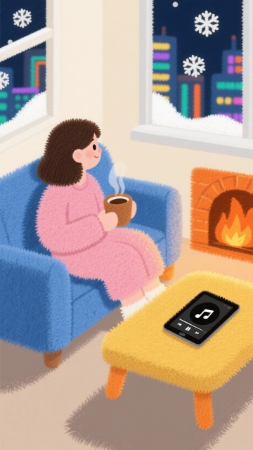 奶油风个的温馨小屋场景,一个少女端着咖啡坐在沙发上看着飘着雪花的窗外,旁边壁炉内火焰燃烧,面前茶几上放着平板电脑放着音乐,暖光摇曳,窗外雪花和城市霓虹灯景