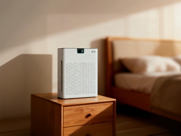 暖光轻雾萦绕,木雕风床头柜上简约加湿器静置,柔光透帘,营造冬日温馨实景感,轻拟物设计呼应自然舒适。