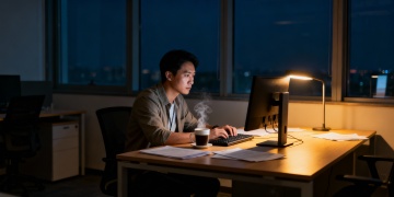 视觉风格:沉稳+故事感背景用:夜景办公室 / 一盏台灯 / 桌面文件文案大字:「十年企服,我见过太多老板白输钱」色调:深蓝 / 深绿 / 暗橙(偏专业)根据上面的内容帮我生成精准的AI专属提示词(用于生成ai图像)