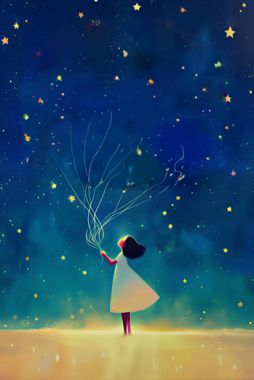 璀璨星光在深邃的宇宙背景中闪烁,呈现出梦幻的水彩风格。画面中,星星以柔和的笔触散布,大小不一,亮度各异,营造出层次感。深蓝色的夜空带有渐变效果,从底部的靛蓝逐渐过渡到顶部的墨黑,其间点缀着淡淡的紫色和粉色星云,增添了浪漫氛围。整体色调温暖而神秘,星光仿佛在流动,给人一种宁静而悠远的感觉。