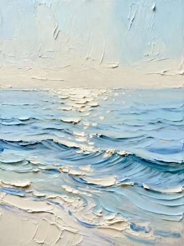 印象派风格海滩风景画,温暖的金黄色调,笔触厚重而富有动感,波光粼粼的蓝色海面与米白色沙滩相接,远处海天一线,天空中漂浮着蓬松的白色云朵,阳光透过云层洒下柔和的光晕,海浪轻轻拍打着沙滩,营造出宁静而浪漫的氛围,充满夏日的活力与惬意。