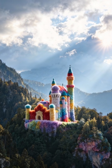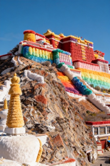 以 “柔绒混搭地标” 为核心灵感:选取布达拉宫这一标志性建筑为主体,保留其红白建筑的辨识度,同时用蓬松雪绒覆于建筑檐角、街巷,搭配毛绒质感的云朵与花坛,让庄重的世界文化遗产融入软萌的童话肌理;街巷中行人、拍照者的存在,既添生活烟火气,又以 “现实人物 + 柔绒场景” 的反差,模糊现实与梦境的边界 —— 用柔软纤维消解地标建筑的肃穆感,织就一场 “神圣地标落进暖糯童话” 的奇幻碰撞,每一处绒感细节都