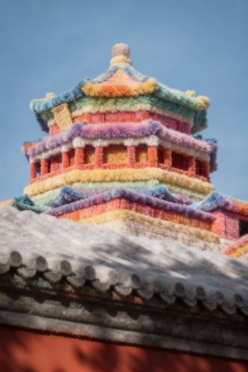 梦幻感与可爱感交织,毛发生长风重构天坛,国潮风融合重拟物设计,面料纹理呈现虚拟现实中的中式建筑奇观。