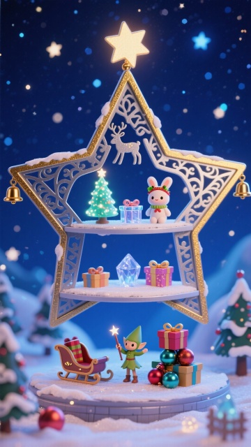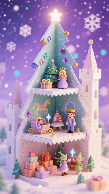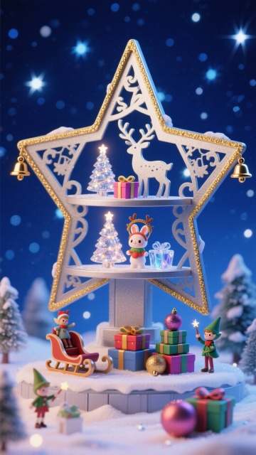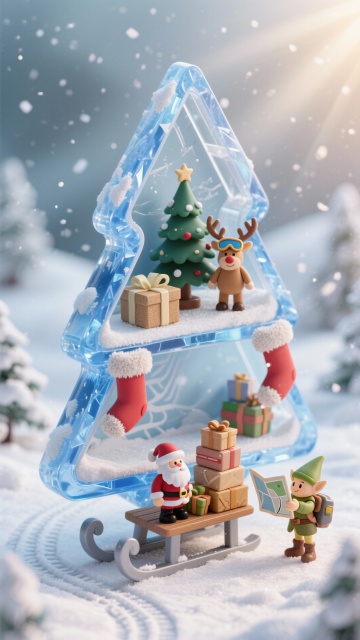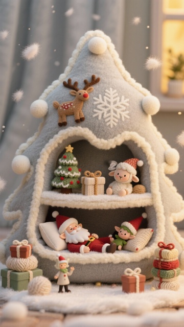 毛绒质感的圣诞树搭配3D微缩艺术风格,卡通化圣诞老人与驯鹿穿梭其间,彩球、礼物堆叠如毛线球,营造出温暖喜庆、趣味十足的节日氛围。