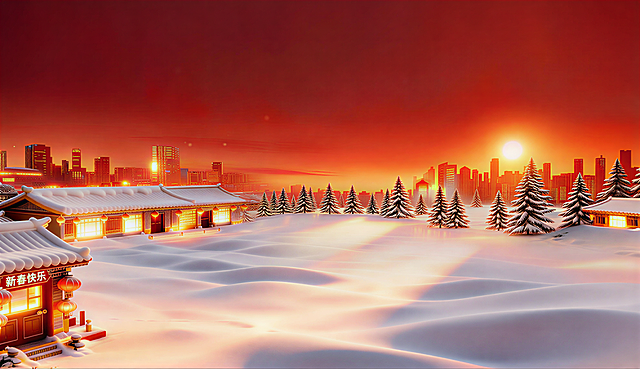 3D 虚拟自然环境,背景是北欧雪镇的夜景,两侧木屋和圣诞树覆雪,点缀圣诞花环,占比小一些,街道铺雪,暖黄 + 雪白配色,明亮温馨。详情