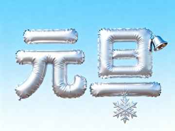 3D金属质感充气字“元旦”,重拟物风设计,搭配铃铛与雪花吊饰,营造喜庆节日氛围。