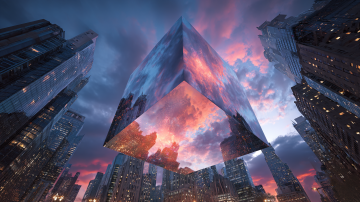 未来感与科技感交织的都市夜景,巨型玻璃立方体悬浮于城市上空,折射出梦幻般的粒子光效,融合3D几何风与虚拟现实美学,营造超现实主义视觉冲击。