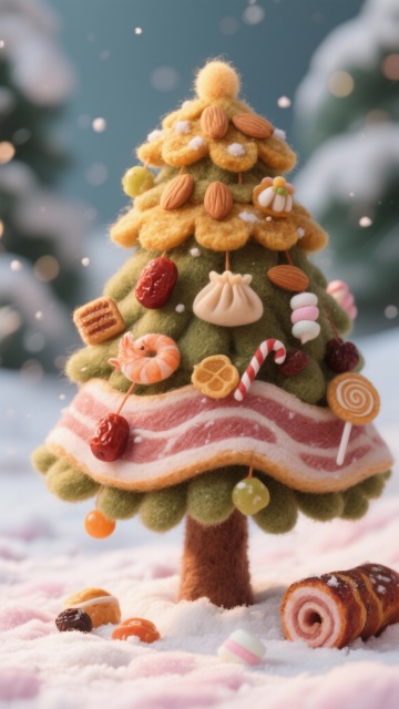 毛绒质感的圣诞树搭配3D微缩艺术风格,卡通化圣诞老人与驯鹿穿梭其间,彩球、礼物堆叠如毛线球,营造出温暖喜庆、趣味十足的节日氛围。