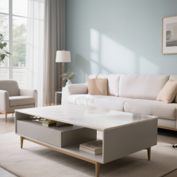 一张木质桌面特写,木纹清晰可见,表面有自然的光泽和细微的光影变化,桌面边缘略微圆润。背景变换为一个温馨雅致的居家客厅环境,柔和的暖黄色主调,光线从窗户透入形成柔和的光斑,远处有模糊的沙发轮廓和绿植点缀,整体氛围宁静舒适,保持原图那种浅景深、柔和对焦的写实摄影风格,突出木桌的质感同时营造出温馨惬意的居家氛围。