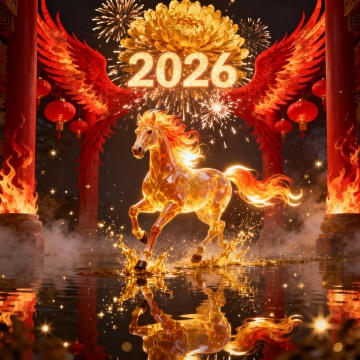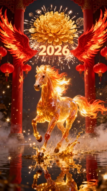 主体:一匹通体发光的黄金神马,位于画面中心,正朝着镜头方向奔跑。马身呈半透明的琥珀质感,肌肉线条清晰可见。 材质与光效:马身散发着炽热的金色光芒,马蹄踏在水面上,溅起液态黄金般的水花,水花在空中化为光点。马鬃和马尾如同流动的火焰,随风向后剧烈飘动,发丝边缘带有明亮的辉光。 背景:两侧的立柱化身为巨大的、燃烧着红色火焰的凤凰羽翼剪影,羽翼中间悬挂着红灯笼,形成一种神圣的通道感。 新增烟花特效:背景深