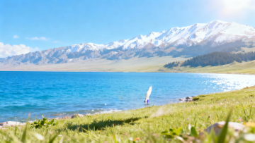 一片广阔无垠的草原背景,天空湛蓝纯净,点缀着几朵形态饱满的白色云朵,阳光明媚,光线充足,草原呈现出层次分明的绿色,从近处的鲜绿到远处的深绿渐变,草原上散落着几顶白色的蒙古包,几匹颜色各异的马正在悠闲地吃草,一条蜿蜒的小河从草原中间流过,河水清澈见底,倒映着天空的颜色,河岸线自然弯曲,整体画面充满了宁静、开阔、自然的氛围,构图采用开阔的远景视角,展现出草原的辽阔与壮美。