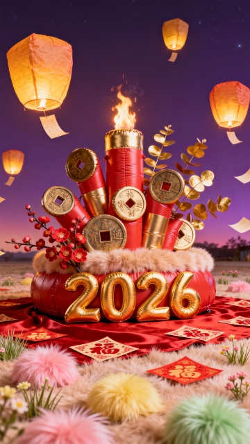 鎏金3D国潮风,重拟物浮雕马跃金币堆,烟花绽放,金属质感与毛绒边饰交织,喜庆梦幻奢华迎2026春节。