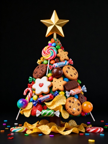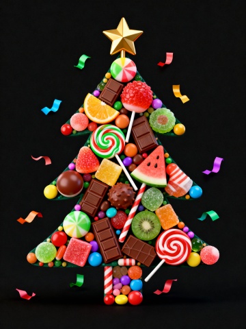 3D重拟物风格的糖果圣诞树,融合波普艺术色彩与拼贴手法,满载喜庆感、甜美感与趣味感,节日氛围浓郁。