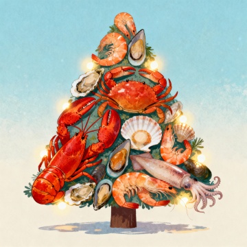 水彩风插画,以海鲜拼成圣诞树,融合梦幻与温馨,轻拟物手法展现超现实节日趣味。