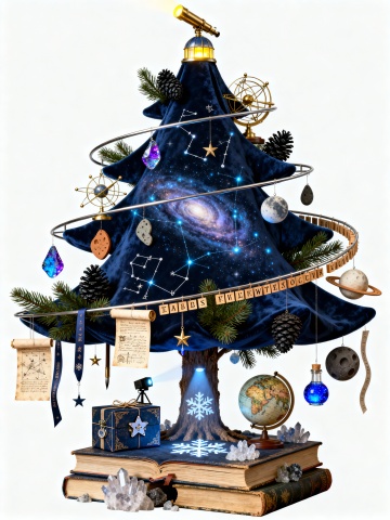 请生成一株由古老典籍构筑的圣诞树。主体由无数泛黄书页折叠成螺旋上升的塔状结构,纸页边缘浸染着岁月沉淀的茶褐色,每道折痕间隐约浮现金粉修复的纹路。书页上的文字如活态藤蔓般蜿蜒游走,字母间偶尔迸发幽蓝火星,仿佛默诵着被遗忘的冬夜诗篇。树冠顶端悬浮着一本摊开的皮质封面巨书,书页无风自动,洒落由发光拉丁文符组成的雪花。