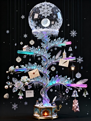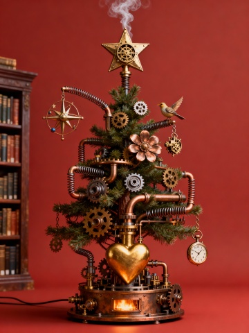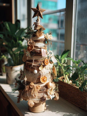 复古感与神秘感交织的纸艺风圣诞树,以古籍拼贴而成,点缀发光字母与雪花,3D浮雕质感营造梦幻光影,暖灯与猫头鹰增添温馨故事感。