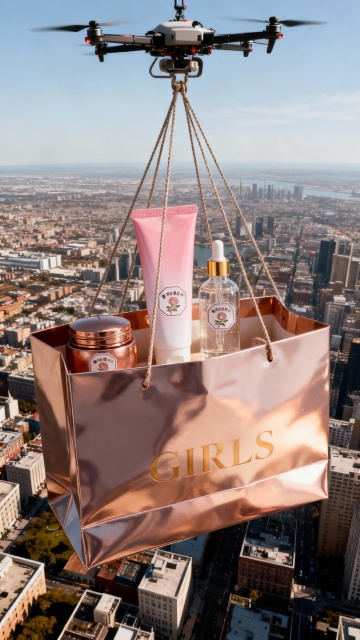 未来感无人机悬吊鎏金购物袋,内藏奢华美妆,金属风与3D质感交织,城市天际线为幕,梦幻唯美中透出科技潮流之美。