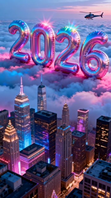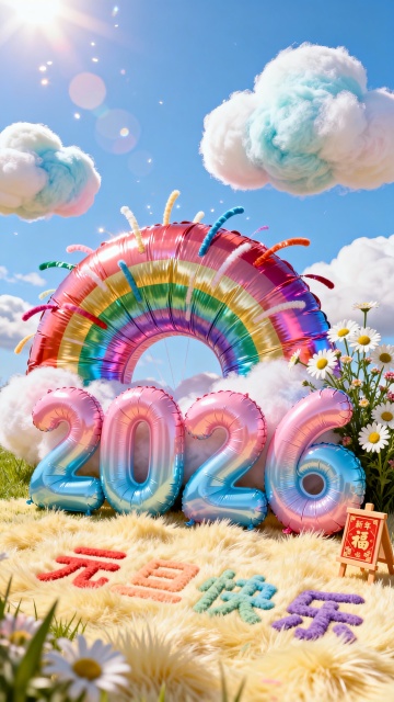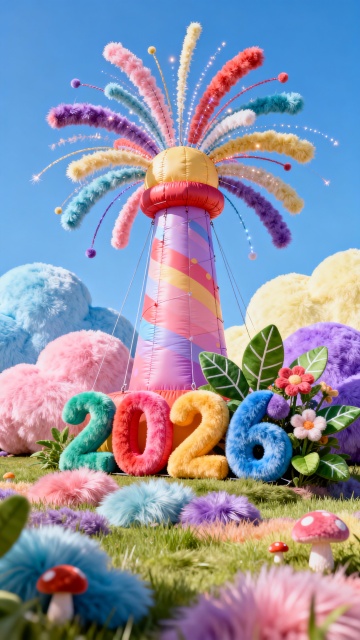 毛茸茸的3D数字“2026”搭配卡通闹钟与烟花,软萌质感融合梦幻光影,营造喜庆可爱的跨年氛围,迎接2025光辉岁月。