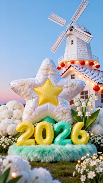 主体为爱心烟花造型的充气装置,前有蜜桃粉配嫩绿色 “2026” 字,旁边少许郁金香与绣球花簇生,背景是浅紫渐变晴空,飘着几只手绘风新年纸鸢,地面摆着彩色野餐篮,装满新年糖果与福字小挂件。
