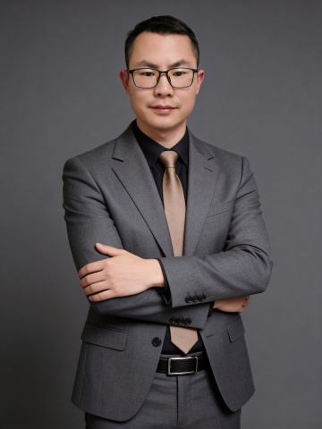保留人物脸型、发型、年龄特征生成标准职场形象照,50MM焦段,F/4光圈(F/2.8-F/4区间),相机与人物距离3米,横向16:9比例(左右预留环境空间),人物占画面60%,入镜头部至膝盖上方5CM,平视视角,人物居中构图,头肩比例协调,身穿深墨蓝色西装,内搭白色衬衫,精致且高级的深蓝色斜向微微渐隐光泽感极细条纹商务感领带,下装黑色西裤搭配黑色皮带;正面抱胸姿态,肢体舒展的站立姿态,自信从容;主