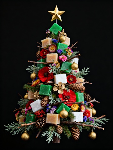 3D风格圣诞树由红绿金三色袜子堆叠而成,融合重拟物与面料质感,点缀金属铃铛与金色星星,营造浓厚喜庆氛围。