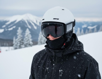 雪域实景中,3D风滑雪装备悬浮跃出收纳袋,重拟物设计融合现代科技感,蓝白配色彰显清爽时尚,虚拟现实般的动态构图尽显运动活力。
