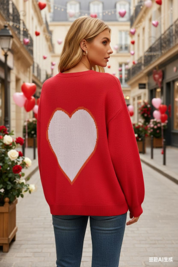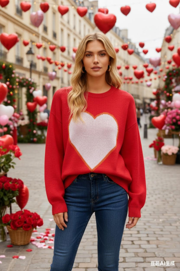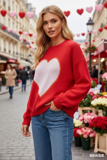 图1为衣服正面,图2为衣服背面,生成到图3的模特身上,高保真还原:极其精确地保留模特发型脸型皮肤和身上的饰品。输出图片不打光感。搭配一条时尚牛仔长裤。背景为一组套图,国外INES场景图带情人节氛围,浪漫。生成不同5张图片分别模特正面,背面,侧面等多个姿势图,模特姿势适合女装商拍的姿势。姿势自然不僵硬。高保真还原:极其精确地保留图1图2中的原始面料纹理、颜色和所有标识。无缝融合:通过完美匹配环境光线、色温和阴影方向.衣服长度到臀部。